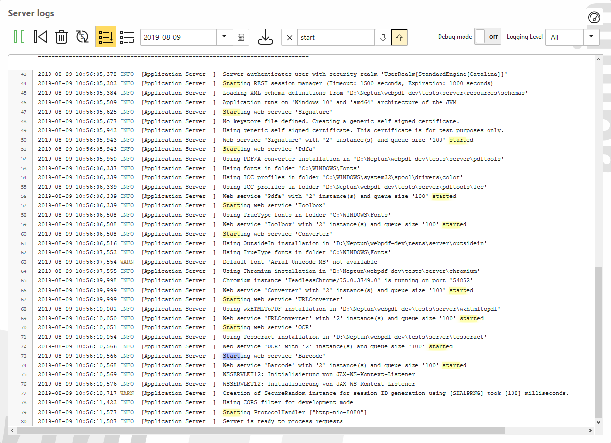 The Debug Modus switch will briefly enable the server debugging mode without restarting the server. All requests to the server will be logged in detail while this mode is active.