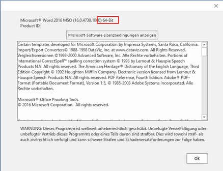 Since webPDF is only available as a 64bit version on Windows, a 64bit Office version must also be used. You can get the information for the installed Office version e.g. in Word 2016 under File -> Account and there with the button About Word. The version and architecture of Word or Office is then displayed in the dialog.