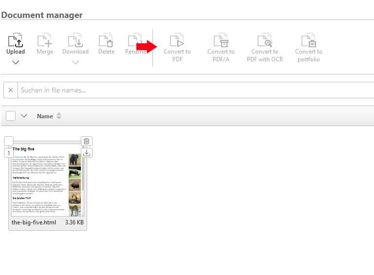 After you have logged in, you can upload the HTML document to the portal. The document will be added to the central document manager of the portal. Select the document and open the Convert to PDF function.