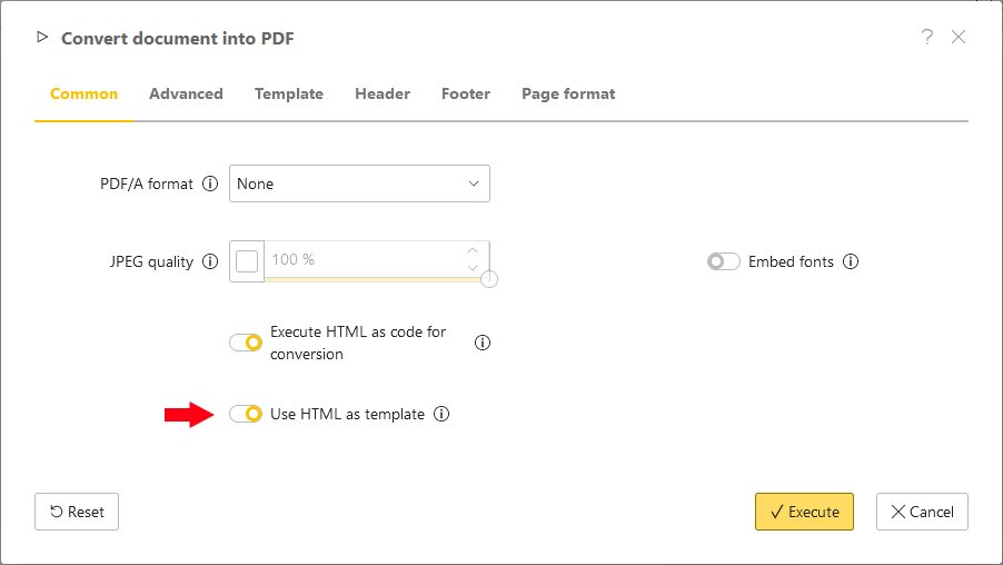 Once the dialog is displayed, activate the option Use HTML as template