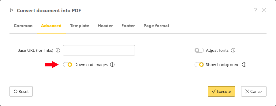 In the Advanced tab, activate the Download images option to add images from external urls to the PDF, which will be used in this example.