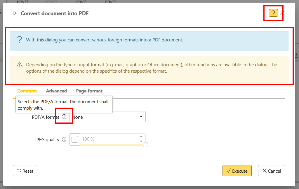 If you require individual help in a dialog, click on the question mark (?) symbol in the top right corner of the dialog. Note texts are displayed in each dialog.