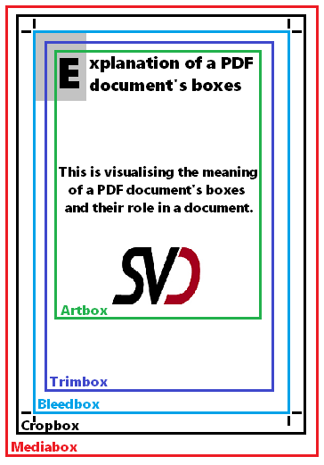 The media box defines the physical dimensions of the untrimmed, printed medium. It is the box that encompasses everything, meaning that all contents must at least be positioned within its limits, as they will otherwise be cropped. -